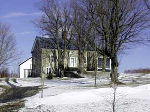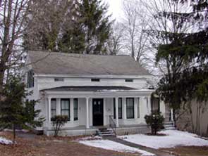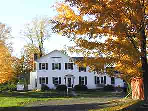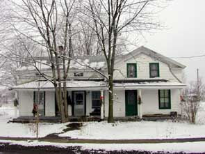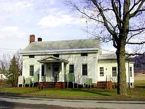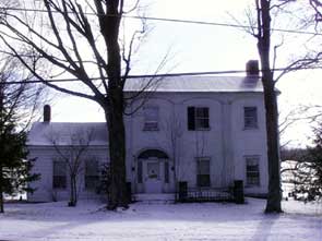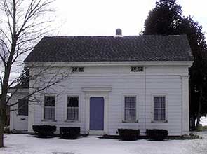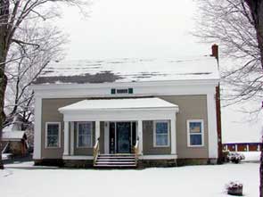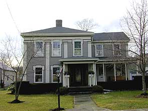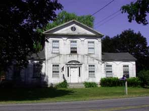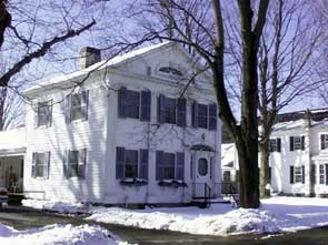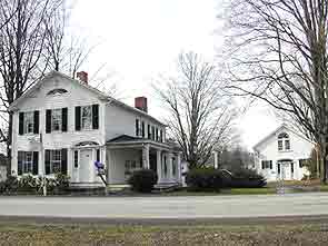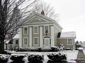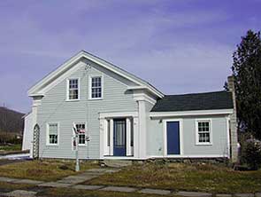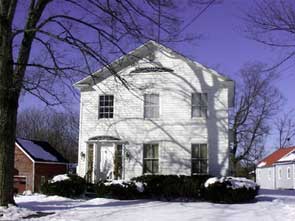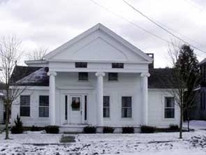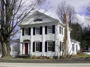 The Greek temple was the model for this style. The triangular pediment supported by columns can be seen in the triangular gabel end accentuated by "returns" at the roof ends (the pediment) with the flat wide vertical corner boards (the columns). Fancy versions would have "real" pediments and columns. Doorways were impressive with wide surrounds, sometimes columns and transom and/or side lights. The wide "frieze" became a wide board under the eaves often with small windows with grilles.